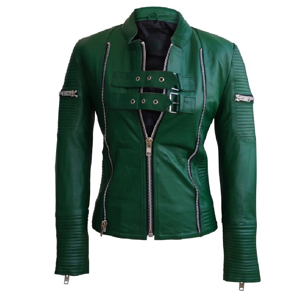 Women’s Green Lambskin Biker Leather Jacket – Dual Buckle Design
