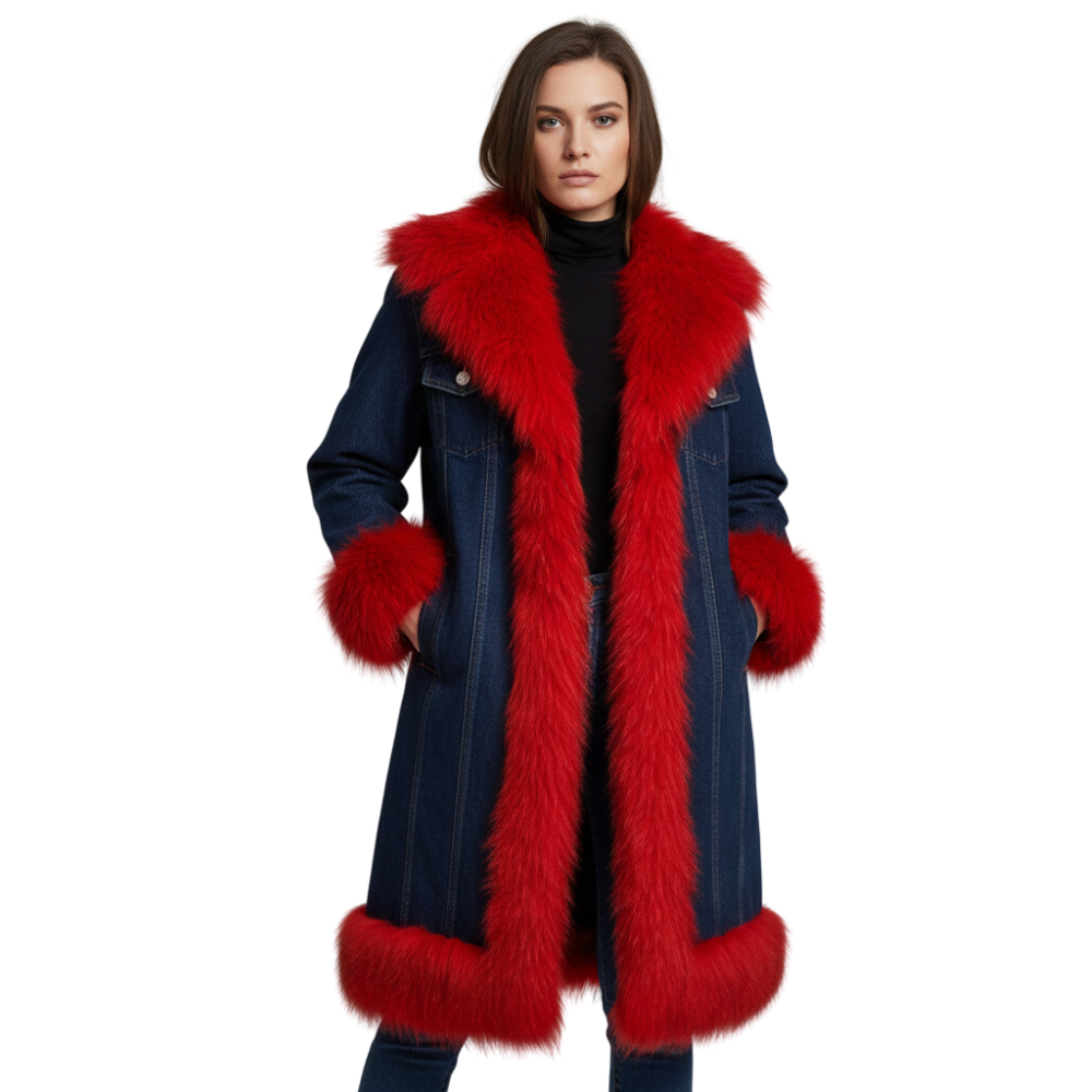 Make a bold style statement with this Women’s Indigo Denim Long Coat, designed to turn heads wherever you go. Crafted from premium indigo denim, this striking piece is elevated with plush vivid red fox fur trimming along the collar, front edges, and hemline. The dramatic color contrast creates a powerful, high-fashion look while maintaining a classic silhouette.