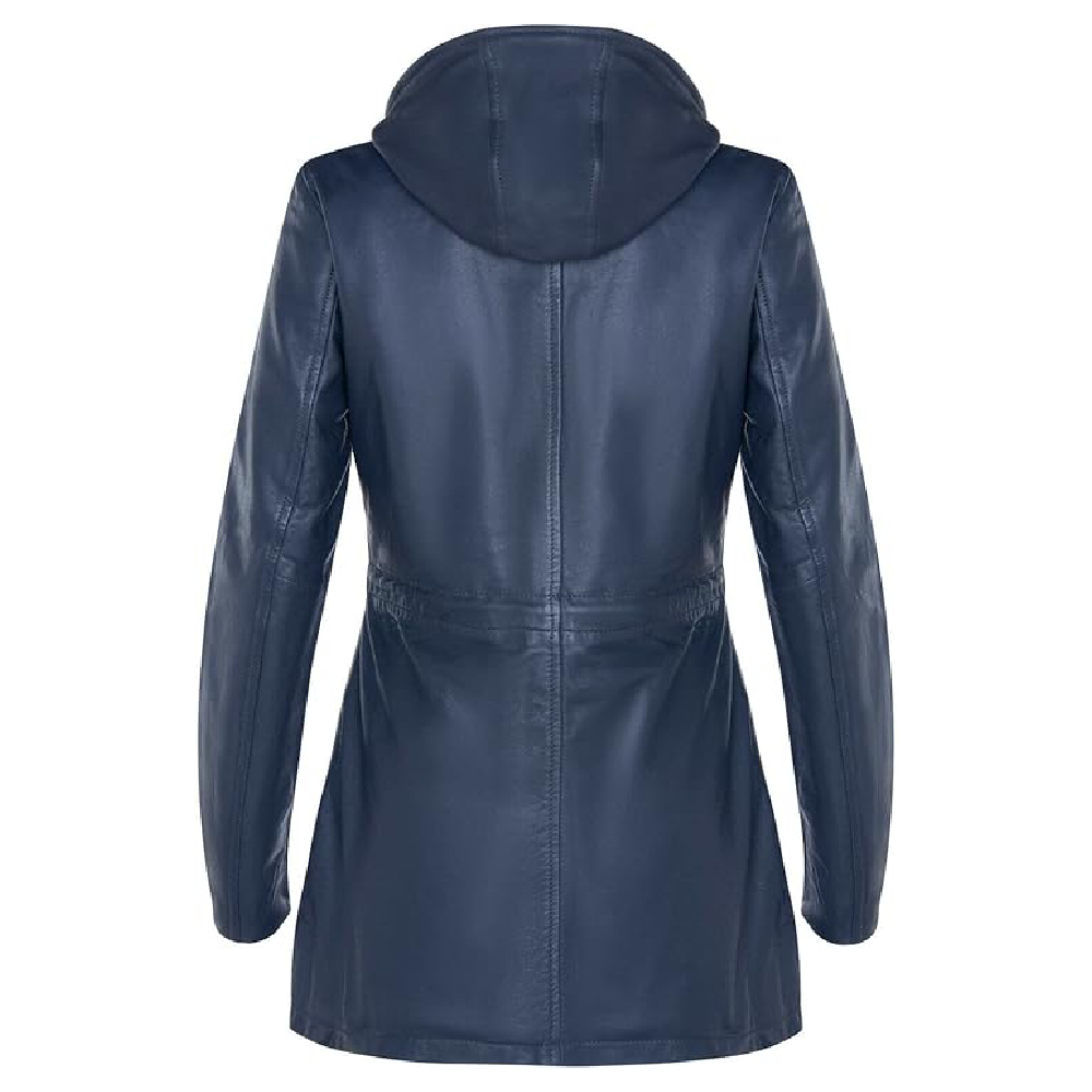 Stay stylish and warm with the Women’s Leather Parka Jacket in Navy Blue, a perfect combination of elegance, functionality, and comfort. Crafted from premium genuine leather, this quilted trench coat features a detachable hood, offering versatile wear for different weather conditions. Its long-length design ensures extra warmth and a sophisticated silhouette, making it an essential addition to your winter wardrobe.