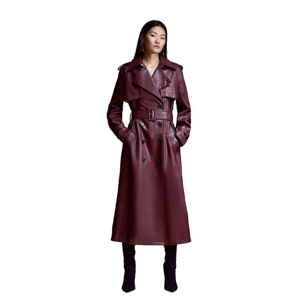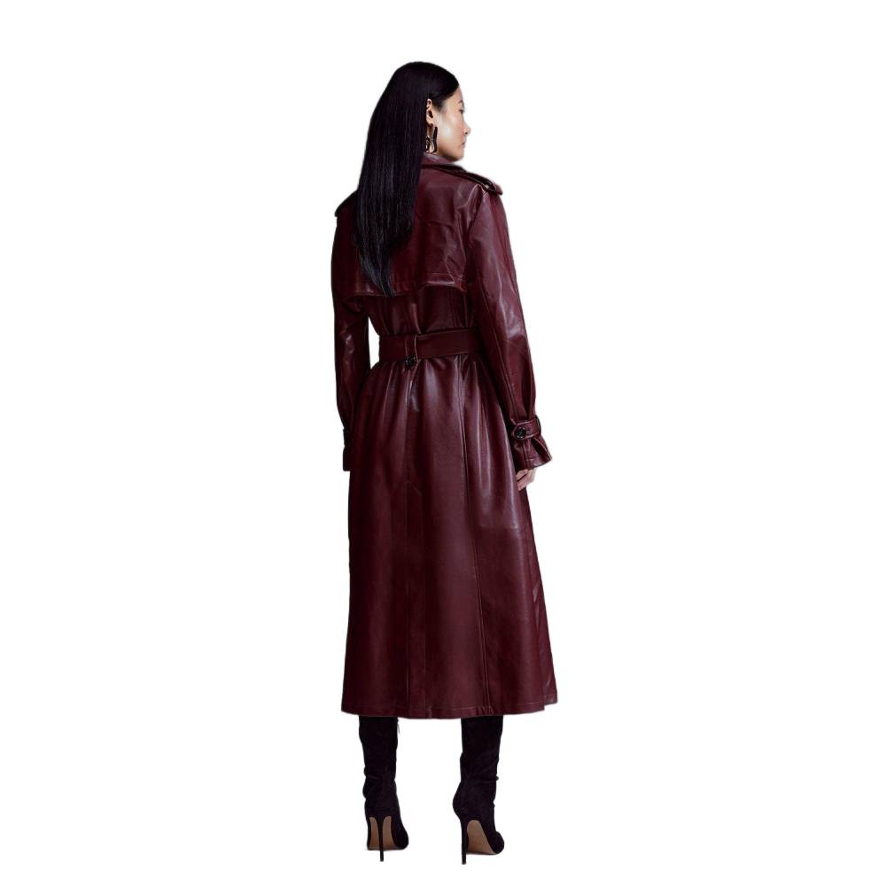 Women’s Long Burgundy Faux Leather Double-Breasted Trench Coat