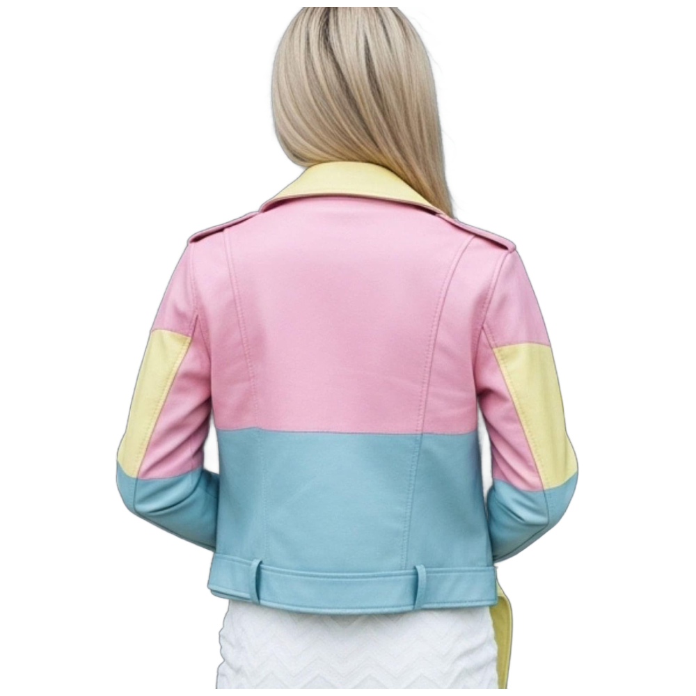 Bring a pop of pastel power to your wardrobe with this color block leather jacket – a perfect balance of fun, fashion, and fearless individuality.