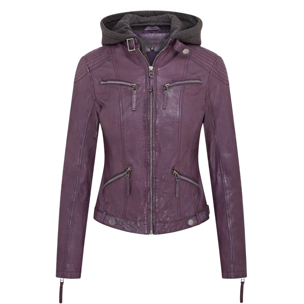Home ALL WOMEN'S JACKETS Women Leather Hooded Women’s Plum Purple Faux Leather Hooded Biker Jacket