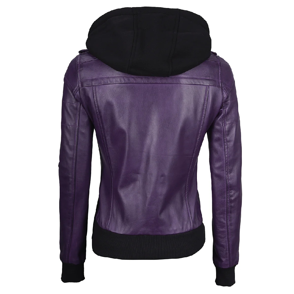 Home ALL WOMEN'S JACKETS Women Leather Hooded Women’s Purple Faux Leather Hooded Bomber Moto Jacket