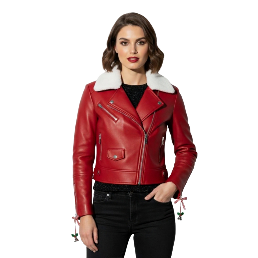 Step into Christmas with confidence and flair in the Women’s Red Faux Christmas Biker Leather Jacket with White Shearling Collar — where holiday warmth meets timeless biker chic.