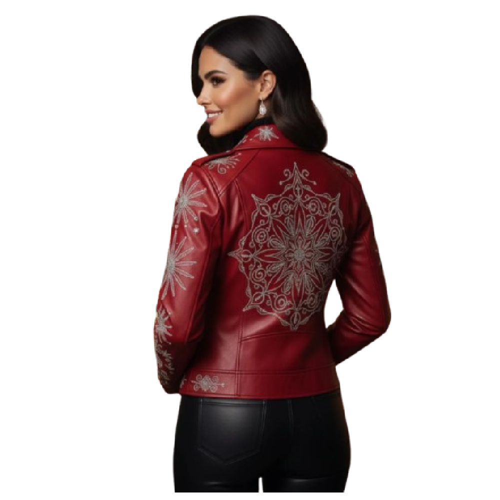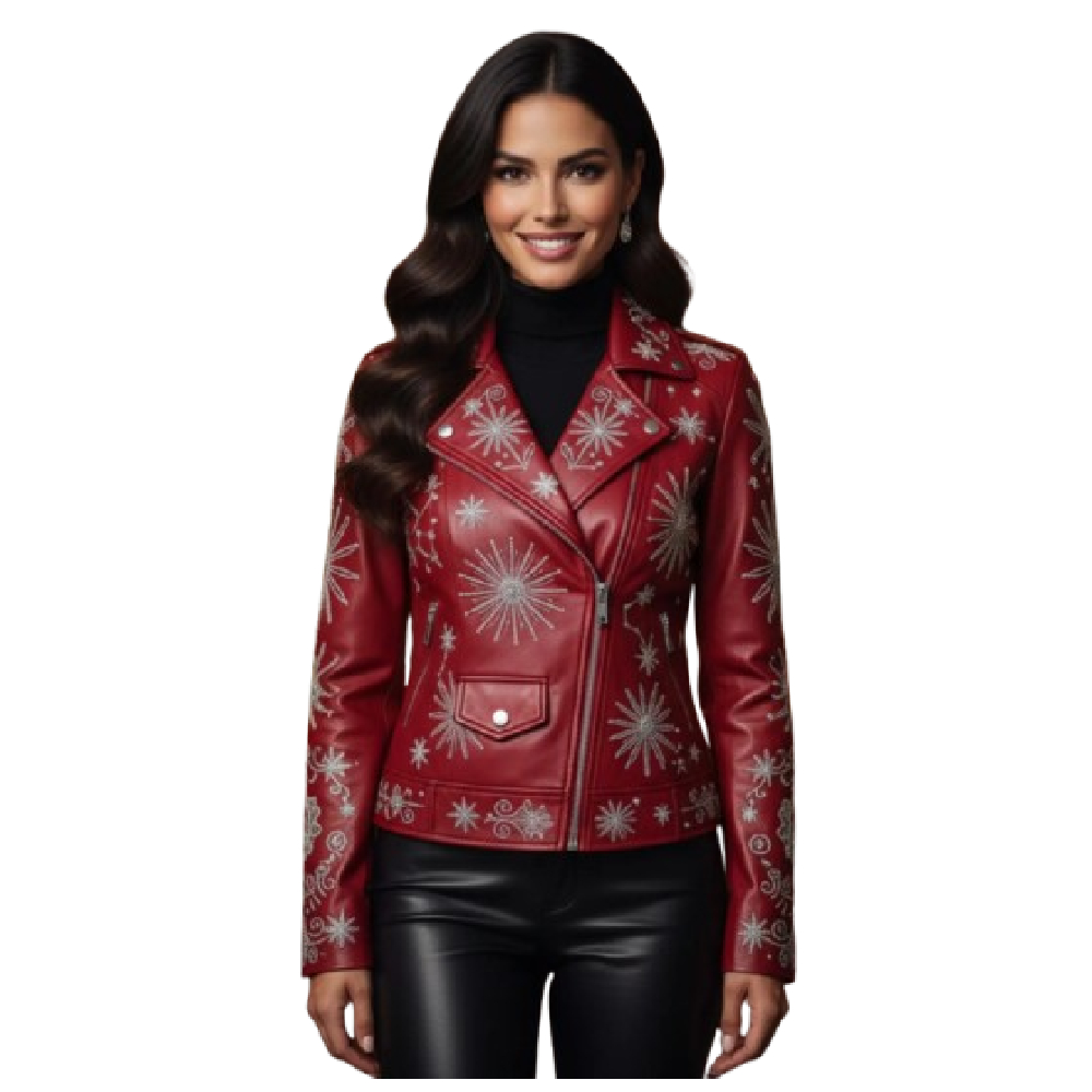Add a festive twist to your winter wardrobe with the Women’s Red Snowflake Christmas Biker Leather Jacket, a perfect blend of edgy moto fashion and holiday cheer. Crafted from premium genuine leather, this jacket features elegant white snowflake embroidery that captures the spirit of the season while keeping your style effortlessly bold.