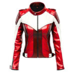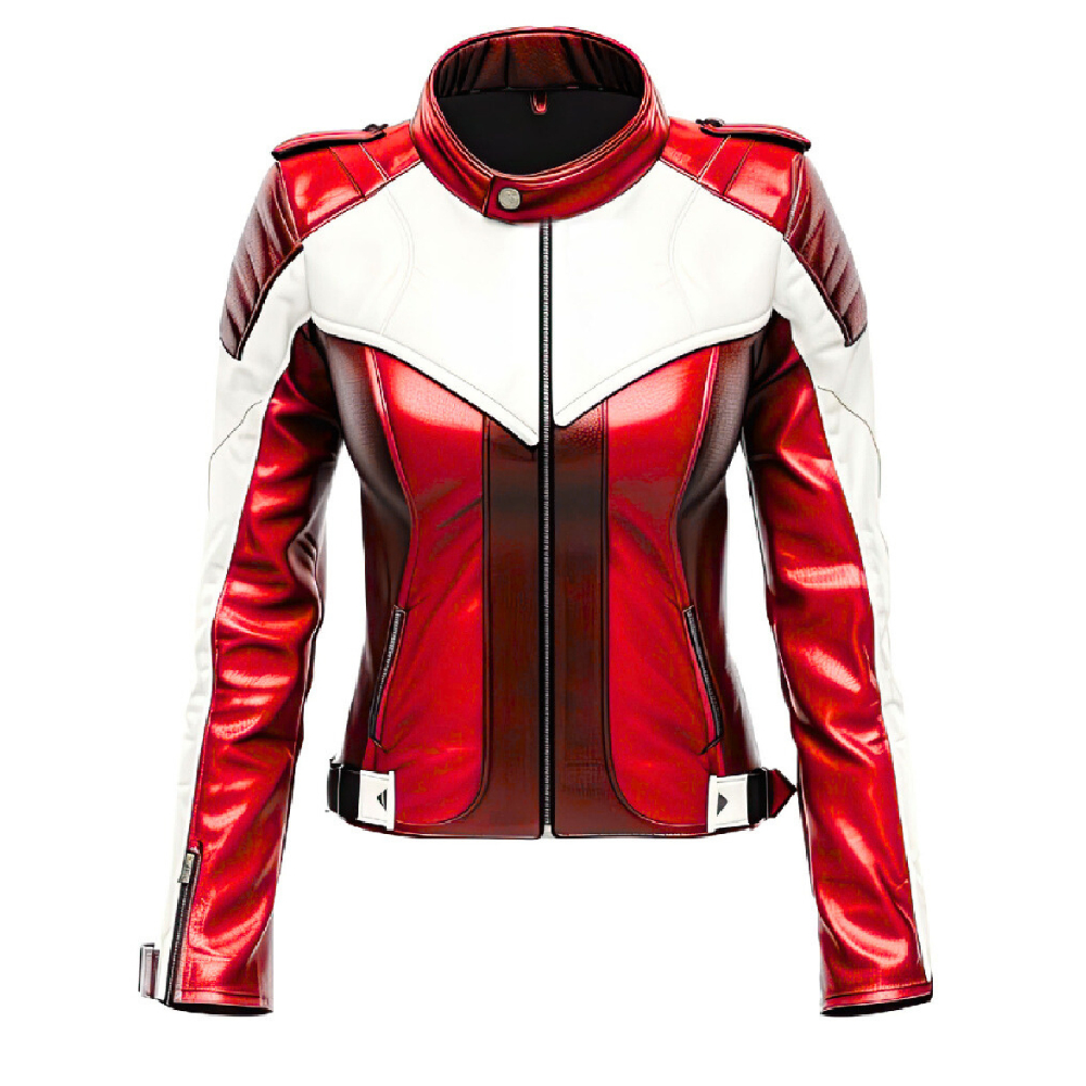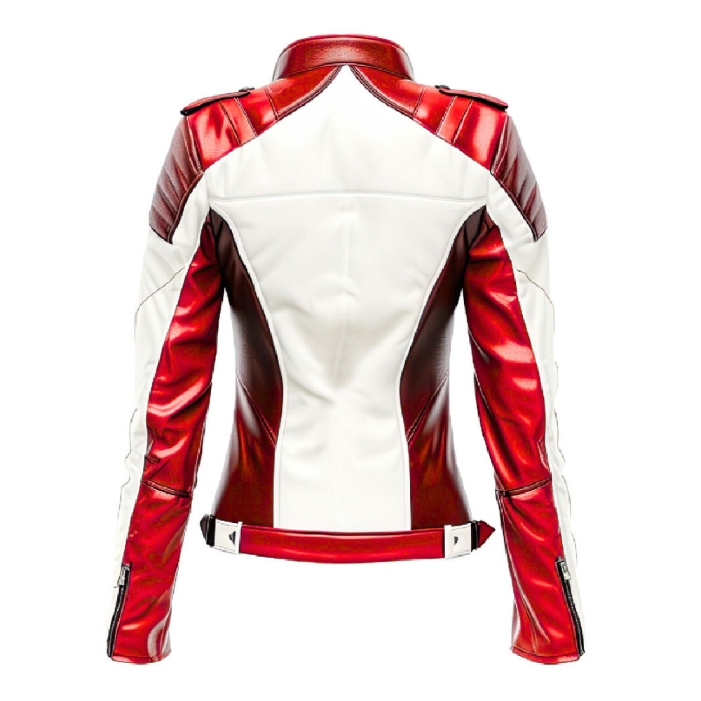 Women’s Red & White Moto Leather Jacket – Metallic Racing Style Biker Jacket