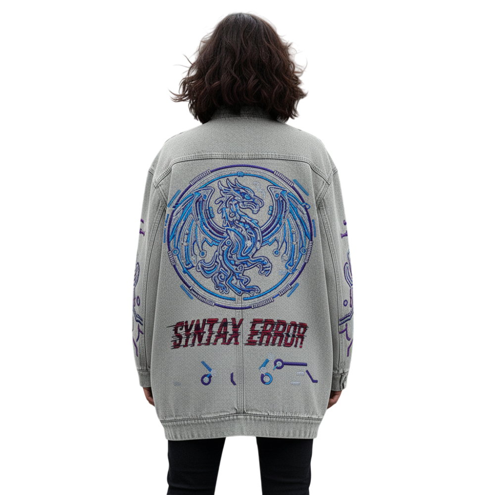 Step into the future of streetwear with the Syntax Error Cyber Dragon Denim Jacket – Neon Blue. This oversized grey denim jacket combines tech-inspired aesthetics with mythical design, featuring neon blue circuit embroidery across the sleeves and chest, culminating in a striking embroidered cyber dragon on the back. The bold oversized silhouette, neon accents, and detailed embroidery make it a standout piece for women who love edgy, statement-making fashion. Durable, comfortable, and visually striking, it’s perfect for layering over hoodies, tees, or casual streetwear.