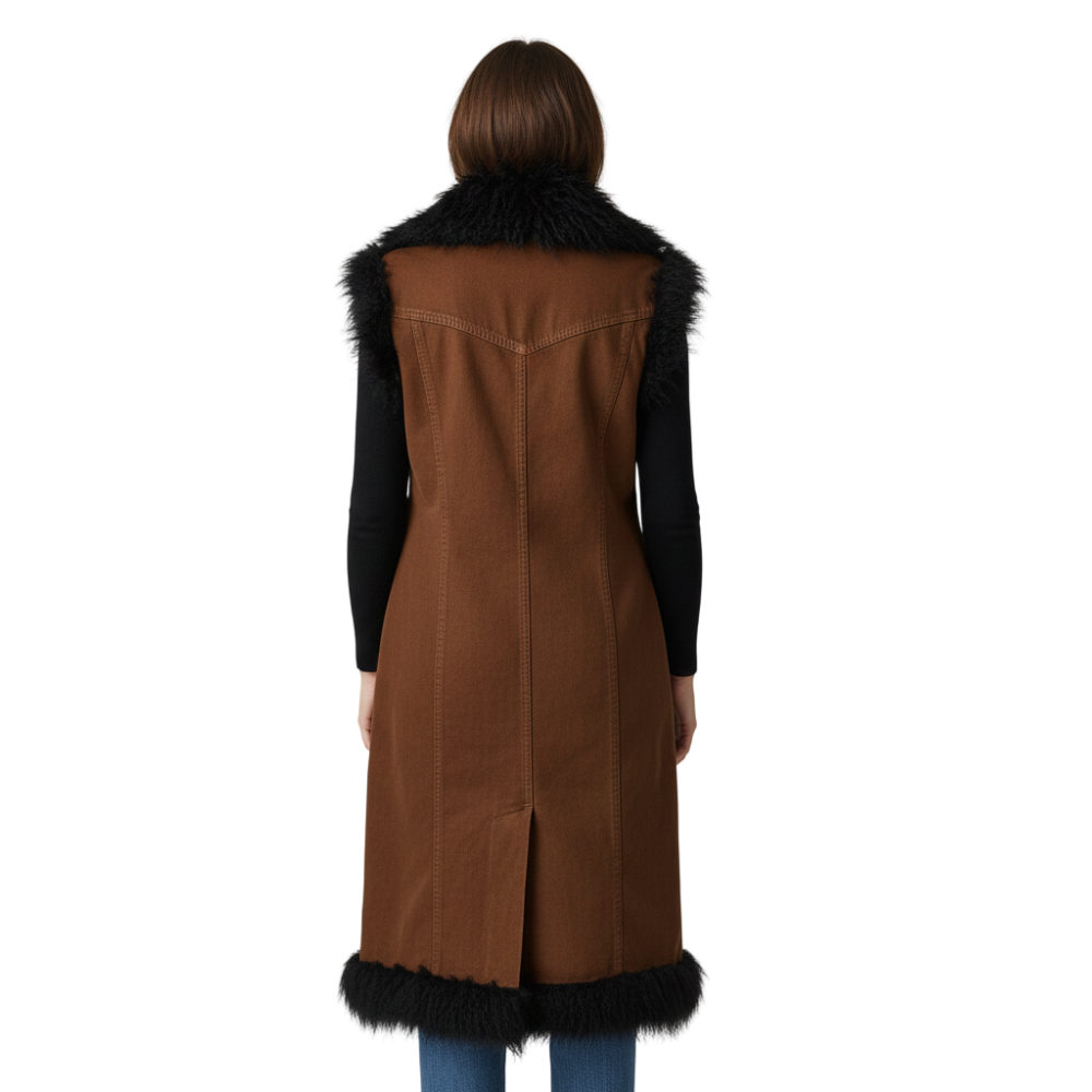 Women’s Tobacco Denim Long Vest Jacket With Black Fox Fur