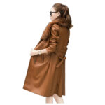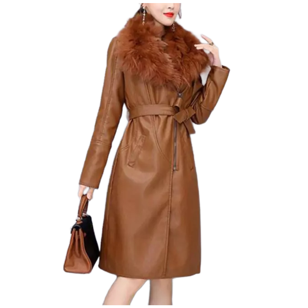 Women’s Warm Slim Long Leather Coat With Big Fur Collar & Belt