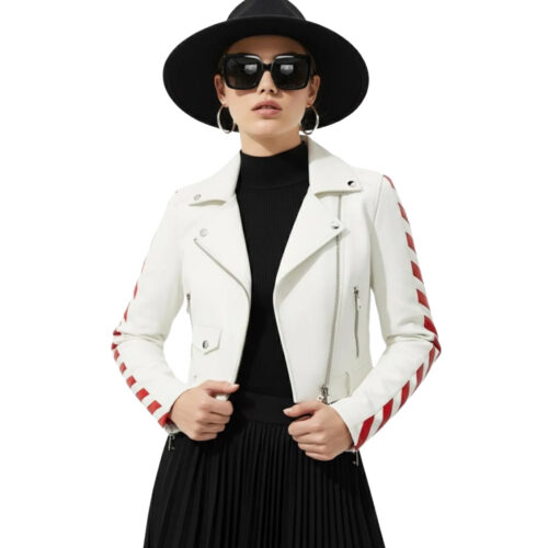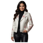 Shine bright this holiday season in the Women’s White Embroidered Biker Christmas Leather Jacket – Elegant Moto Style, where festive grace meets bold, confident fashion.