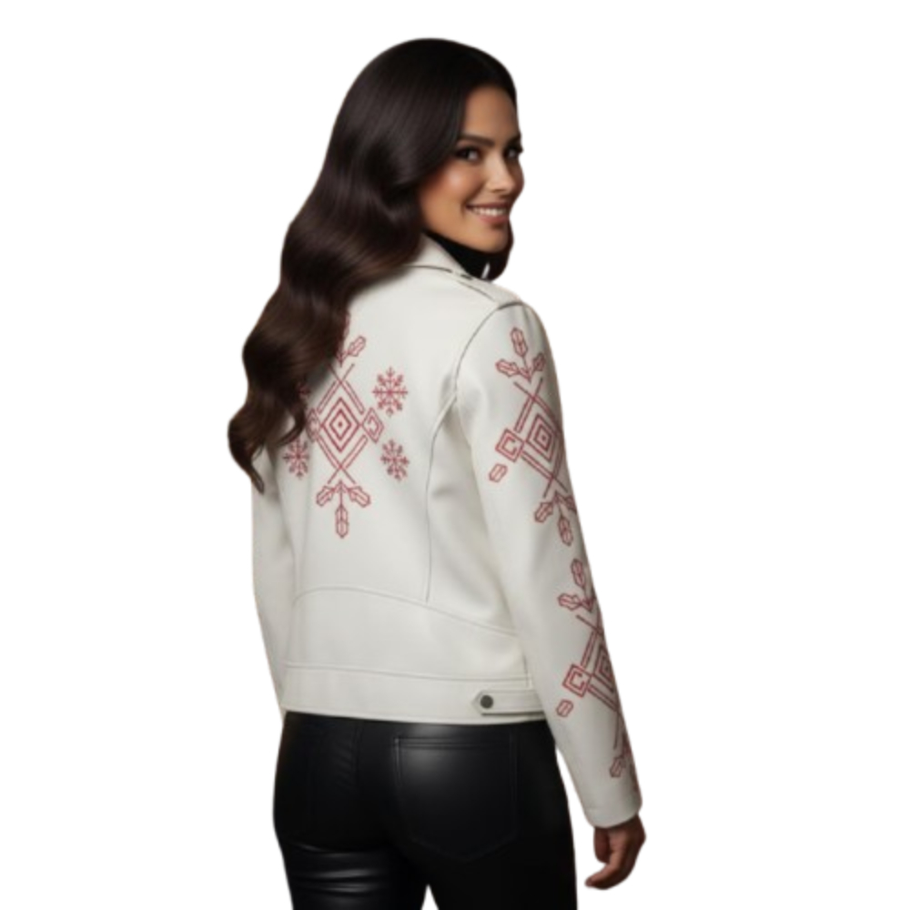 Women’s White Embroidered Biker Christmas Leather Jacket – Elegant Moto Style