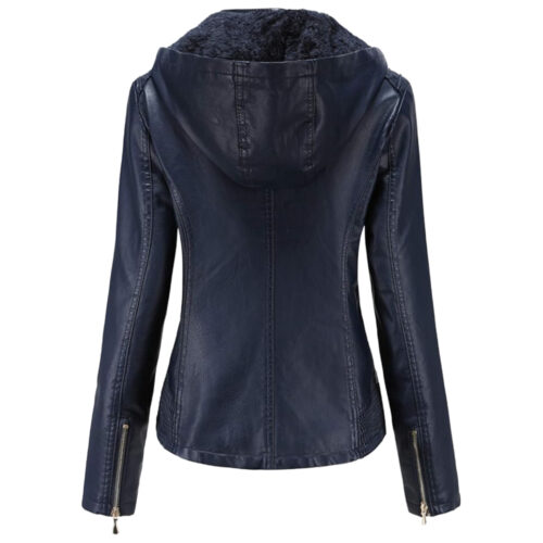 Women’s Midnight Blue Faux Leather Hooded Moto Jacket With Plush Fur Trim